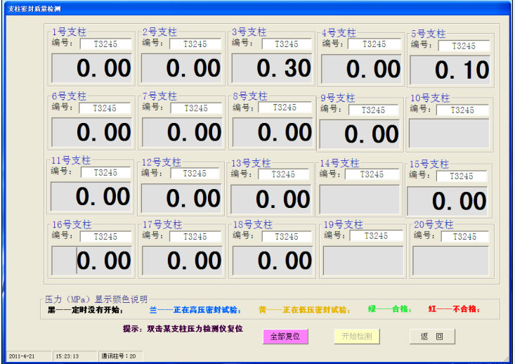 4、采用高級編程技術(shù)對采集的壓力數(shù)據(jù)進(jìn)行處理,根據(jù)設(shè)定的參數(shù)自動判定支柱密封質(zhì)量是否合格,自動形成檢測報表并存貯。